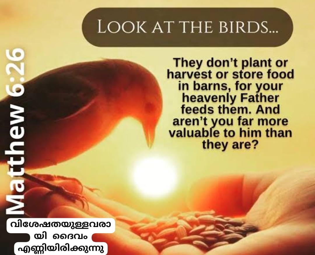മത്തായി 6:26 “ആകാശത്തിലെ പറവകളെ നോക്കുവിൻ; അവ വിതെക്കുന്നില്ല, കൊയ്യുന്നില്ല, കളപ്പുരയിൽ കൂട്ടിവെക്കുന്നതുമില്ല എങ്കിലും സ്വർഗ്ഗസ്ഥനായ നിങ്ങളുടെ പിതാവു അവയെ പുലർത്തുന്നു; അവയെക്കാൾ നിങ്ങൾ ഏറ്റവും വിശേഷതയുള്ളവരല്ലയോ ?”