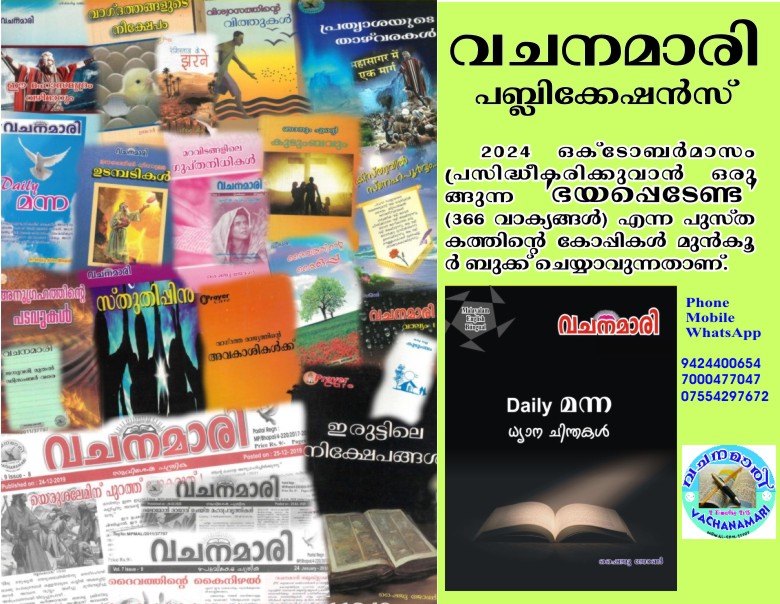 ദൈവവചനം പഠിക്കുന്നവർക്കും, പഠിപ്പിക്കുന്നവർക്കും ഒരുപോലെ പ്രയോജനപ്പെടുന്ന ആത്മീയ സന്ദേശങ്ങളാണ് വചനമാരി പുസ്തകങ്ങളിലുള്ളത്. കൂട്ടായ്മകളിലും സഭായോഗങ്ങളിലും ദൈവവചന ശുശ്രൂഷക്ക് ഏറെ സഹായകമാകുന്ന, വചനമാരി പ്രസിദ്ധീകരിച്ചിരിക്കുന്ന 22 പുസ്തകങ്ങളിൽ ചുരുക്കം ചില കോപ്പികൾ മാത്രമാണ് വിതരണത്തിനുള്ളത്. കൂടാതെ ഒക്ടോബർമാസം പ്രസിദ്ധീകരിക്കുവാൻ ഒരുങ്ങുന്ന ‘ഭയപ്പെടേണ്ട’ (366 വാക്യസമാഹാരം) എന്ന പുസ്തകത്തിൻ്റെ കോപ്പികളും ഇപ്പോൾ മുൻകൂർ ബുക്ക് ചെയ്യാവുന്നതാണ്.