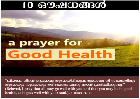 ദൈവമക്കൾ നല്ല ആരോഗ്യത്തോടും സ്വസ്ഥതയോടുംകൂടെ ഇരിക്കണമെന്നുള്ളത് ദൈവഹിതമാണ്. ഒരു ദൈവപൈതൽ നല്ല പുഷ്ടിയോടും ദീർഘായുസ്സോടെയും ഇരിക്കേണ്ടതിന് വേദപുസ്തകം നിർദ്ദേശിക്കുന്ന ചില ദിനചര്യകളുണ്ട്. അവയിൽ നിന്ന് തിരഞ്ഞെടുത്ത പ്രധാനപ്പെട്ട പത്തു കാര്യങ്ങൾ തിരുവചനത്തിൽ നിന്ന് നമുക്കു ധ്യാനിക്കാം.